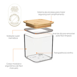 Los Potes Herméticos Modo Bambu están disponibles en 8 tamaños, proporcionando 40.320 posibilidades de modulación. Su tapa de bambú mantiene las características únicas de apilamiento y encaje de la línea Modo, garantizando más flexibilidad y aprovechamiento de espacio.