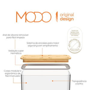 Los Recipientes Herméticos Modo Bambú están disponibles en 8 tamaños, permitiendo hasta 40.320 posibilidades de modulación. Su tapa de bambú mantiene las características de apilamiento y encaje de la Línea Modo, uniendo funcionalidad y estética.