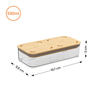 En color Cristal, el recipiente posee apariencia sofisticada semejante al vidrio, pero con la ventaja de ser más resistente y duradero. La tapa de bambú natural añade un toque refinado a la organización, permitiendo que el recipiente sea utilizado tanto en armarios como expuesto sobre encimeras y estanterías.