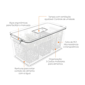 El Organizador Dry 6 Litros cuenta con tres cestas internas removibles, permitiendo separar y acomodar alimentos con las mismas características de almacenamiento, como arándanos, fresas y mini-zanahorias. Así, optimizas el espacio y facilitas el acceso a los artículos en la nevera.